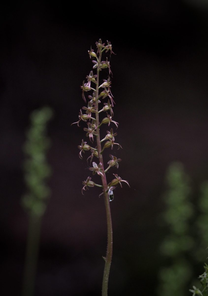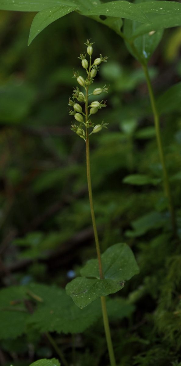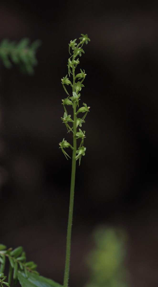 Despite its small stature, the above-ground portion of the heart-leaf twayblade is more posy than plant, as at least the upper half of the stem consists of an unbranched flower cluster, or, raceme that bears up to twenty-five flowers. Below ground, this perennial’s trailing rhizomes5Rhizomes are thickened stems that grow along or under the soil surface and bear shoots above and roots below. may send up additional stems that eventually become separate plants. For this reason, a heart-leaf twayblade seldom appears alone and many in a given population are clones of one another. An individual plant typically has only one stem, but may bear as many as three, each clasped by a single pair of triangular or roughly heart-shaped leaves (hence the common name “twayblade”, or, “two leaf”). These leaves may have either straight or wavy edges. Rarely, a plant produces one or more additional leaves higher on the stem. The entire orchid can reach up to 13 inches/33 cm, although it is usually no more than half that height. The stems are slightly fuzzy and tend to match the color of the blooms. Upon close inspection, a small bract6Bracts are leaves that occur within or just below a flower cluster and often differ in size, form, and sometimes color from ordinary leaves. is visible on the stem at the base each bloom.