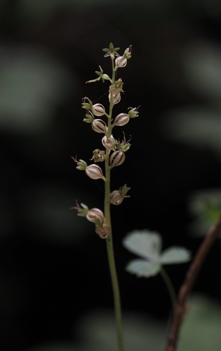 The heart-leaf twayblade blooms from late spring to late summer in shades ranging from chartreuse through mauve and deep mahogany, often with individuals of varying colors occurring in the same population. Its most notable feature is its dramatically forked labellum, the lower petal in an orchid that is often uniquely shaped to facilitate pollinator interaction with the bloom. In the heart-leaf twayblade, the labellum is much longer than its other petals and the petal-like sepals1Sepals are modified leaves that enclose a flower bud before it opens and are usually green. that fan above it. The circular nectary at the center of the flower dispenses nectar down a groove in the labellum, forming an enticing runway for the tiny fungus gnats that are its primary pollinators. At the top of the labellum, two additional pointed lobes extend below the nectary, providing convenient “handholds” for the gnats to grasp as they drink and conveniently positioning them below the column that arches above. As in most orchids, the stamens2A stamen is the male reproductive structure of a flower, consisting of an anther in which pollen is produced and usually a slender filament that attaches it to the flower. An individual flower typically has many stamens. and stigma3A stigma is the organ at the tip of a flower’s female reproductive structure that receives pollen. It is typically connected to the ovary by a style. These three parts together comprise the pistil. are fused into a central column over the labellum. The heart-leaf twayblade’s column is armed with trigger hairs that release dollops of sticky pollen onto the backs of the gnats to carry on to the next flower unawares. After pollination, the flower’s inferior ovary4The ovary is the female organ at the base of a plant’s female reproductive structure that produces seed and becomes the fruit or other layer around it. Together with the stigma that receives pollen and is typically attached to the ovary by a style, it comprises the pistil. An ovary is inferior when it is positioned entirely below the point at which all floral components join. quickly swells into a globose seed capsule. The flower often remains unspent until the capsule splits along its parallel ribs to scatter microscopic seeds onto the wind.