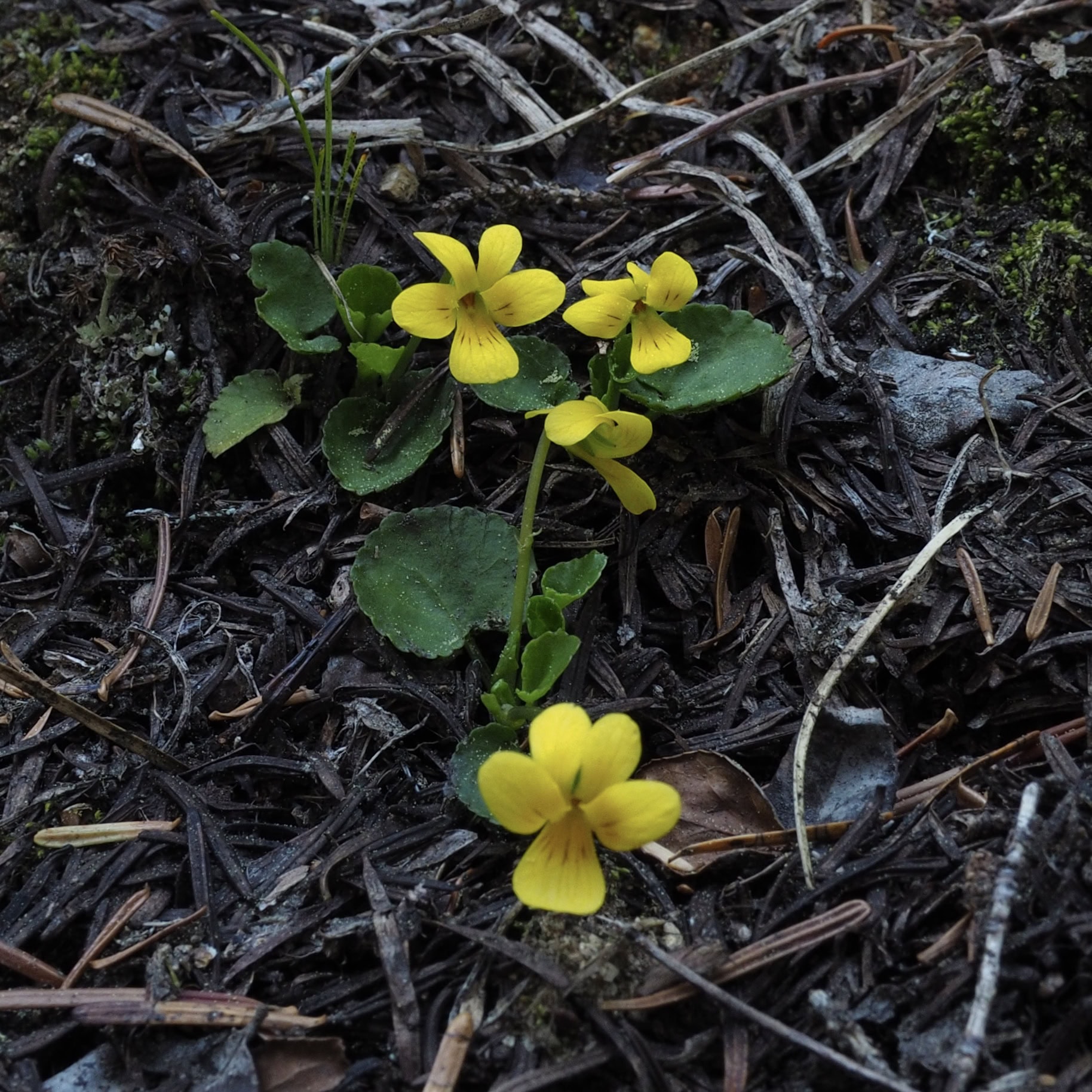 The evergreen, or, redwood violet (Viola sempervirens) is a coastal Pacific Northwest staple of conifer woodlands. Blooming as early as winter in mild locations and sometimes continuing sporadically throughout the year, it adds interest to the deep forest shadows where little else flowers. Diminutive in size (typically not more than 3.00 inches/7.50 centimeters in height), it is easily overlooked, although its spreading habit sometimes results in eye-catching patches of gold.